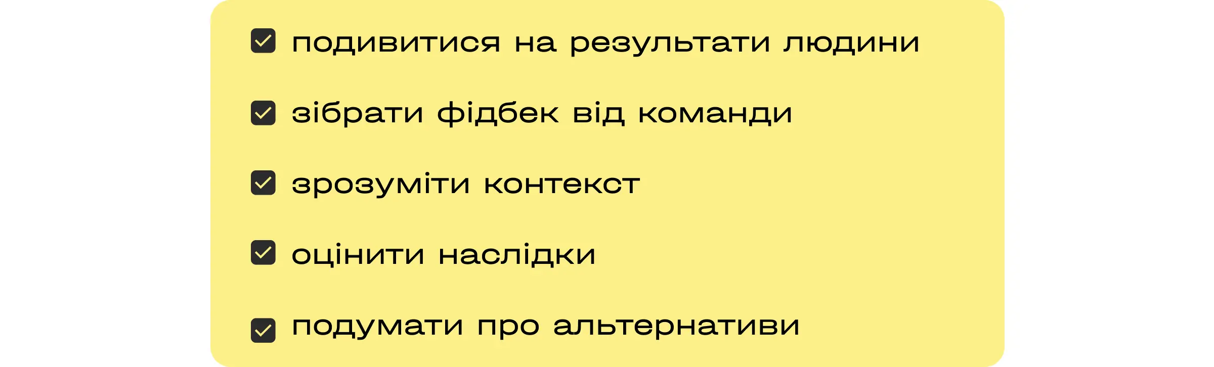 Автономність — це не «віддати й забути». Йдеться про створення умов, у яких люди справді можуть ухвалювати якісні рішення. Як варіант можна взяти власний спосіб мислення і перекласти його в зрозумілу логіку для команди. Наприклад, якщо я сам обмірковую звільнення співробітника, то проходжу певний внутрішній чек-лист: