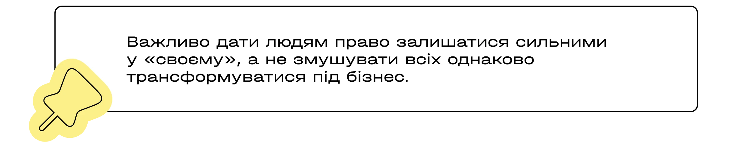 На старті компанії потрібні одні навички: швидкість, гнучкість, мультизадачність, комфорт у хаосі. А на етапі масштабування — зовсім інші: системність, побудова процесів, структура, автоматизація. І це не означає, що людина, яка була сильною на старті, автоматично стане ефективною в новій реальності. Це нормально, що хтось не підходить під наступний етап, починає втрачати інтерес, або відчувати нудьгу, або просто хоче працювати в іншому темпі. Не обов’язково всіх «переломлювати» під нові вимоги. Можливі різні сценарії: комусь знаходять роль, яка йому більше підходить, а з кимось — прощаються.
