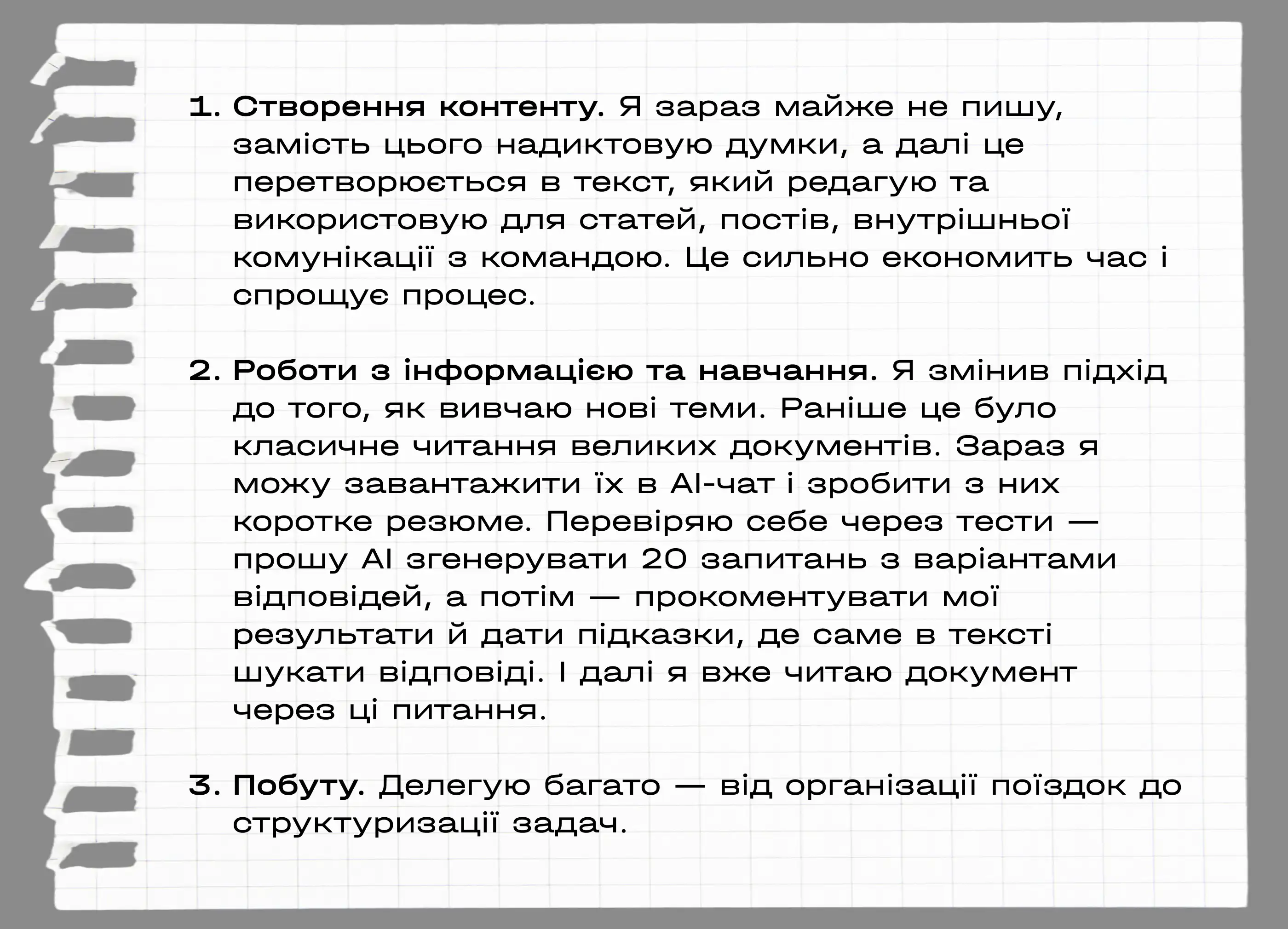 В нас була можливість і ресурси, тож ми почали одразу це застосовувати в себе. В результаті шлях від ідеї до запуску власного успішного кейса зайняв близько 2,5 місяця. Не роки, не тисячі годин, а кілька місяців. Звісно, далі ти все одно адаптуєш під себе, робиш помилки, але проходиш цей шлях значно швидше.